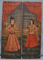 INDE Paire de panneaux peints double face à décor de personnages, oiseaux et rinceaux 48 x 16 cm