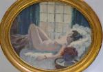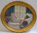 H. E. WAGNER (XXème siècle) Le modèle endormie, 1936 Huile sur toile ovale signée et datée en bas vers la gauche 50 x 61 cm