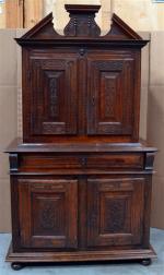 PETIT BUFFET DEUX CORPS en noyer, haut à retrait dit diminutif ouvrant à quatre portes et un tiroir, décor sculpté