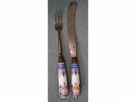 ROUEN Fourchette et couteau, les manches en faïence à décor polychrome de lambrequins XVIIIème siècle L. max : 20 cm (fêle à un manche)