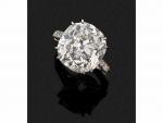 BAGUE en platine 850 millièmes, ornée au centre d'un diamant coussin de taille ancienne, entre huit petits diamants ronds également de taille ancienne. Signé "Monture CARTIER". Tour de doigt : 53 (avec ressort réducteur). Poids brut : 7 gr Accompagné d'un rapport d'analyse diamant du L.F.G. n° 318032, daté du 26/05/2016, précisant : - poids : 14,34 ct - couleur : G - pureté : VS1 - fluorescence : faible