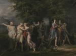 Charles MEYNIER (Paris 1768 - 1832) Télémaque, pressé par Mentor, quitte l'île de Calypso Sur sa toile d'origine 154 x 203 cm Signée et datée en bas à gauche : ch. meynier / an . 8 En bas à droite, une étiquette fragmentaire Restaurations anciennes, petits accidents, déchirures Provenance : - Acheté au Salon de 1800 par le citoyen Joseph Fulchiron (1744-1831) pour 4000 francs. Celui-ci, un banquier d'origine lyonnaise, est un collectionneur de Meynier puisqu'il lui avait déjà acheté Androclès (perdu) au Salon de 1795 et commandé un Milon de Crotone (perdu aussi mais dont le modello est au Musée des Beaux-Arts de Montréal). - Château de la Seilleraye , - Acquis au début des années 1930 par les ascendants de l'actuel propriétaire , - Par descendance à l'actuel propriétaire. Bibliographie : - Charles-Paul Landon, Annales du Musée et de l'Ecole Moderne des Beaux-Arts, Paris, vol. 1, pp. 31 - 32, pl. XIV, 1801, Paris , - Antoine Schnapper, Arlette Sérullaz, sous la direction de, Jacques Louis David, 1748 - 1825, cat. exp., 1989, p. 527 , - Dorothy Johnson, " Jacques-Louis David, The Farewell of Telemachus and Eucharis ", Getty Museum Studies of Art, Los Angeles, 1997, pp. 47-48 , - Philippe Bordes, Jacques-Louis David, Empire to Exile, cat. exp., 2005, pp. 247 - 248 gravure de Châtaigner reproduite fig. 34 , - Isabelle Mayer-Michalon, Charles Meynier 1763-1832, Paris, Arthena, p. 39, pp. 130-131, P.38 (tableau perdu). - Les commentaires de critiques du Salon de 1800 sont retranscrits dans l'ouvrage d'Isabelle Mayer-Michalon pp. 262 et 263. Expositions : - Paris, Salon de 1800, n° 266 (deuxième prix de première classe), - Paris, Exposition des prix décennaux au Louvre, août-novembre 1810. Oeuvres en rapport : - Huit études sont signalées dans la vente Bruun-Neergaard, Paris, Hôtel de Bullion, 29 août-7 septembre 1819, n° 246, Probablement six études sont signalées dans la vente après-décès de Meynier, Paris, 26 novembre-4 décembre 1832 (Mes Petit et Pieri-Bénard), n°52, - Deux dessins préparatoires de la composition sont conservés dans deux collections particulières, l'un aux Etats-Unis (op. cit. p.188 , n° D43), l'autre en France (op. cit., p.189 , n° D44, - Gravure au trait par Normand pour Landon, - Gravure à l'eau-forte de Châtaigner, dessinée par S. Le Roy et terminée par Bovinet. Ce tableau-clef de la carrière de Charles Meynier et de l'histoire du néoclassicisme français a reçu des éloges de la critique et du public lors de sa présentation au Salon de 1800 et en 1810. Disparu depuis deux siècles, le tableau était connu par sa composition conservée par la gravure de Châtaigner reproduite dans la monographie de 2008. Elève de François-André Vincent, il partage le Prix de Rome en 1789 avec Girodet et séjourne en Italie jusqu'en décembre 1793. A son retour à Paris, il multiplie les esquisses, mais la situation politique n'est guère favorable à ses projets. C'est sous le Consulat et au début de l'Empire qu'il donne ses meilleurs tableaux, dont la galerie des Muses pour l'hôtel Boyer-Fonfrède (Cleveland, Museum of Art) ou notre Télémaque : d'ailleurs notre Télémaque et une des Muses, Polymnie, qui préside à l'Eloquence (toile, 275 x 177 cm, The Cleveland Museum of Art) sont exposés au même Salon de 1800. Nous retrouvons la même harmonie sourde de bleu gris et de jaune d'or visible dans la figure de Polymnie et présente dans notre tableau vers la droite par le rapprochement entre les deux figures de Calypso et sa servante. Sous l'Empire, il reçoit des commandes de tableaux militaires à la gloire de l'Empereur et réalisera trois plafonds pour le musée du Louvre, encore en place. Son sujet est tiré du roman d'apprentissage de Fénelon publié en 1699, les Aventures de Télémaque, réimprimé tout au long du XVIIIème siècle (76 éditions sont parues entre 1800 et 1815). La tragédie lyrique de Deray et Lesueur de 1796, avec un duo entre les deux amants, avait encore ajouté de la popularité à ce thème. Si le jeune héros est bien un des personnages principaux de l'Odyssée d'Homère, fils modèle de Pénélope et d'Ulysse, protégeant sa mère, puis son père des prétendants, la nymphe Euscharis, servante de Calypso, est inconnue de la mythologie grecque. Elle est inventée par l'écrivain qui décrit entre eux une passion fugitive, contrariée et chaste, provoquant la jalousie de sa maîtresse Calypso, amoureuse elle aussi de Télémaque. Le précepteur de celui-ci, Mentor (en fait Minerve déguisé en vieux sage), les sépare. Le récit de Fénelon n'est pas celui d'un héros éprouvé dans sa chair comme Ulysse face à une série de défis physiques, mais plutôt de l'évolution morale d'un héros, à travers des expériences, des passions et des renoncements qui le rendent humain et qu'il doit apprendre à maîtriser s'il veut être un sage dirigeant. Comme l'a montré Dorothy Johnson, les rôles traditionnels sont ici inversés. Ce sont les femmes, les chasseuses et le jeune homme est leur proie. Cet épisode a inspiré les peintres tout au long des XVIIIème et XIXème siècles : Henri de Favanne, Natoire et Louis Lagrenée avant Meynier, Jacques-Louis David en 1818 (Los Angeles, Getty Museum), Lafond en 1802, Auguste Quinsac Monvoisin en 1824 (Minneapolis Institute of Art), des suites gravées de Lordon... Daté de 1800, ce Départ de Télémaque participe d'un court moment de détente de l'art français, après dix années de peintures de propagande exaltant les valeurs patriotiques et la Révolution, et avant quinze autres années qui vont être consacrées à glorifier l'Empire et ses victoires militaires. L'ambiance argentée générale, la façon dont la lumière tombe sur la scène (sur les épaules de la compagne à droite, par exemple), et la description précise des espèces végétales jusqu'aux détails de la sandale orfévrée ou de l'arc qui se termine en tête de cygne recourbé d