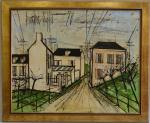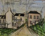 En 1970, il faut de l’audace à Bernard Buffet pour assembler sans les mélanger les couleurs qui composent notre tableau car chaque couleur est distincte, distanciée même par rapport à l’autre : blanc pour les maisons, bleu pour le ciel, vert pour la nature, brun clair pour la route, noir pour les contours et les arbres. C’est toute la magie de cette peinture que d’avoir su marier un traité rigoureux avec des coloris simples et pourtant savants.