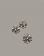 Ensemble composé de trois broches fleurs dont une plus importante en or 750 millièmes et argent 925 millièmes, chacune sertie au centre d'un diamant principal de taille ancienne et de forme coussin dans des entourages de diamants de taille ancienne et taillés en rose.
