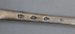 CUILLERE A RAGOUT en argent, modèle uniplat, la spatule gravée d'armoiries sous une couronne de marquis Saint Malo, 1770-77 Maitre orfèvre: Joseph Louis BENNABEN, reçu en 1748 L.: 35 cm Poids: 176 gr