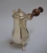 VERSEUSE en argent uni, reposant sur trois pieds en enroulement, le bec verseur à clapet, le frétel en fruit, le manche en bois tourné