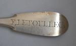 CUILLERE A RAGOUT en argent, modèle uniplat, la spatule gravée Vannes, XVIIIème Maitre orfèvre: Joseph Pierre Marie TIRET, reçu en 1765 L.: 33 cm Poids: 136 gr