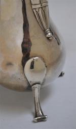 CHOCOLATIERE en argent uni, reposant sur trois pieds en enroulement, le bec verseur cannelé en bec de canard, le frétel et le manche en os
