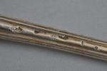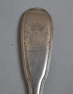 CUILLERE A RAGOUT en argent, modèle filets, la spatule gravée d'armoiries d'alliance sous couronne de marquis XVIIIème L.: 29.5 cm Poids: 152 gr