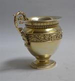 TASSE sur piédouche en vermeil à décor de frises de feuilles lancéolées, de perles, de feuilles de vigne, l'anse appliquée Paris, 1819-1838 H.: 11.5 cm Poids: 218 gr