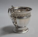 TASSE en argent reposant sur un piédouche, à décor de frises de perles, feuilles lancéolées et motifs ornementaux, anse latérale Paris, 1819-1838 H.: 11 cm Poids: 166 gr