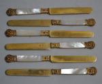 Suite de six COUTEAUX A FRUITS les lames en vermeil (800/1000e), les manches en nacre Paris, 1819-1838. Orfèvre: LB L.: 20 cm Poids brut: 210 gr