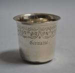 TIMBALE dite CURON en argent, le col souligné d'une frise végétale, le corps gravé Début XIXème H.: 6.5 cm Poids: 72 gr (petits chocs)