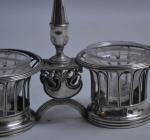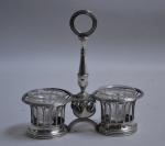 SALERON DOUBLE en argent à décor ajouré, filets, la prise sommitale en anneau, on y joint deux verrines en verre gravé Paris, 1819-1838 H.: 17.5 cm Poids net: 214 gr