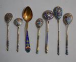 Ensemble de sept CUILLERES en vermeil (84 zolotnik) et émaux polychromes Travail russe L. max: 15.5 cm Poids brut: 146 gr
