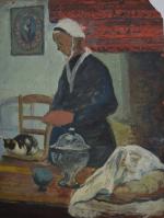 Charles MILCENDEAU (1872-1919) Maraichine au chat dans un intérieur vendéen Gouache sur papier cartonné signée en bas à gauche 46 x 34.5 cm (usures, manque)