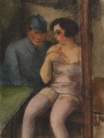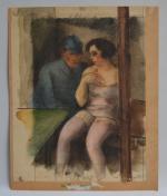 Jean LAUNOIS (1898-1942) Soldat approchant une prostituée Dessin et aquarelle signé en bas à droite 41.5 x 31.5 cm (piqûres)