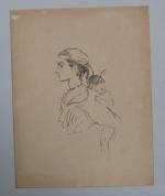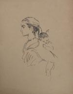 Jean LAUNOIS (1898-1942) Mère portant son enfant sur le dos Encre avec traces de cachet du monogramme en bas à droite 27 x 21 cm (piqûres, traces de colle)