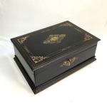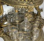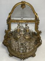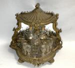 Exceptionnelle CAVE A LIQUEURS en bronze représentant un théâtre couvert foncé de glaces, comprenant trois carafes et leurs bouchons et dix verres à liqueurs, la partie supérieure se relevant par un mécanisme
