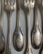 Suite de huit FOURCHETTES A DESSERTS en argent, modèle filets feuillagés, chiffrées Minerve Poids: 350 gr