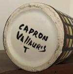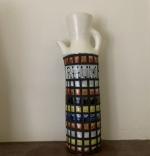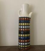 Roger CAPRON (1922-2006) Rhum Forme S9 émail blanc , décor de pavé polychrome en réserve de paraffine Bouteille à alcool en faïence stannifère signée et située à Vallauris sous la base H.: 32.5 cm