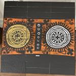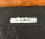Roger CAPRON (1922-2006) Table en fer à plateau de céramique carré à décor orangé, brun, entretoise en H Signé dans le décor 70 x 60 x 61 cm Provenance : Galerie Martel Greiner