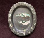 JL à Vallauris Plat ovale en terre cuite émaillée noire à décor de deux oiseaux émaillé blanc et vert Monogramme incisé 25.5 x 21.5 cm