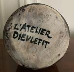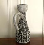 Jacques POUCHAIN (1925-2015) L'Atelier DIEULEFIT Pichet tronconique légèrement bombé en faïence à décor de quadrillage centré de cercles sur fond noir, large col sphérique à bec ; anse appliquée Signé