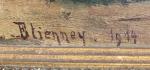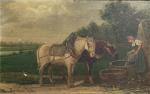 ETIENNEY (XIX-XXème) Les chevaux venant s'abreuver, 1914. Huile sur carton signée et datée en bas à gauche 18.5 x 29.5 cm (petits manques, légères griffures)