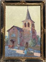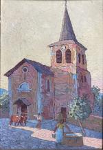 Ronan LOTH (1893-1959) Femme au puits et vacher devant l'église du village Huile sur carton signée et dédicacée "Au docteur Bodet hommage reconnaissant" en bas à gauche 47.5 x 33 cm (usures)