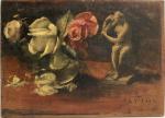 Pierre Alexis LESAGE (1872-1932) Bouquet de roses près de la statuette Huile sur panneau signée en bas à droite 24 x 33 cm
