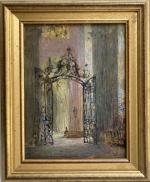 ECOLE FRANCAISE du XXème La grille ouverte dans l'église Huile sur carton toilé 31 x 23 cm à vue