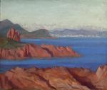 Marcel Victor D'ETERNOD (1891-1971) Paysage aux rochers devant les montagnes enneigées Huile sur toile signée en bas à droite, annotée "Miramar" au dos 46 x 55 cm