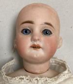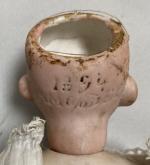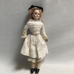 Poupée mannequin, tête porcelaine marquée en creux 1894 , "AM 6/0 DEP" , sur collerette porcelaine non marquée , sur corps en cuir (défaut aux doigts), ensemble de vêtements blancs, chapeau, chaussures d'origine, perruque d'origine, 34 cm tres bel état