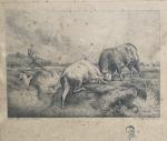Jean CORABOEUF (1870-1947) Combat de taureaux, d'après le tableau de Brascassat Gravure signée en bas à gauche 31 x 34.5 cm à vue (piqûres)