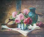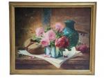 Alfred Arthur BRUNEL DE NEUVILLE (1852-1941) Nature morte aux pivoines et la mandoline Huile sur toile signée en bas à droite de son pseudonyme Laurence 54 x 65 cm