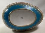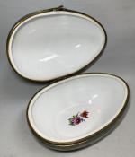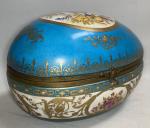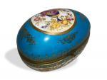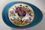 Important OEUF couvert en porcelaine formant boite, à décor polychrome et or, la monture en laiton H.: 20 cm L.: 31 cm P.: 23 cm
