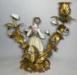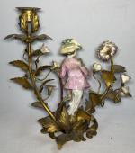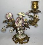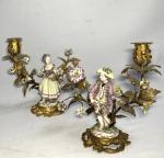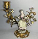 Paire de BOUGEOIRS en bronze doré et porcelaine de Saxe représentant chacun un personnage au milieu de fleurs et branches fleuries Style Louis XV, fin XIXème H.: 21.5 cm (petits accidents, notamment aux doigts)
