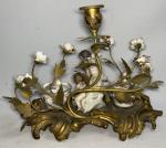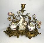 ENCRIER en bronze doré et porcelaine de Saxe représentant deux angelots tenant une guirlande et encadrant deux réceptacles en porcelaine devant des branches fleuries et feuillagées
