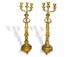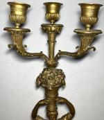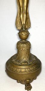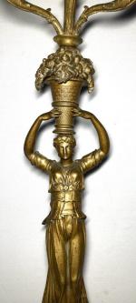 Paire de CANDELABRES en bronze, la base ronde reposant sur trois pieds griffes, surmontée chacun d'une vestale tenant un bouquet à trois bras de lumière XIXème H.: 58.5 cm