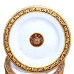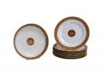 Suite de neuf assiettes plates et une assiettes creuse en porcelaine à décor d'une frise feuillagée sur l'aile et d'un panier fleuri dans un médaillon au centre