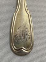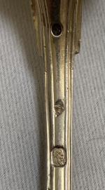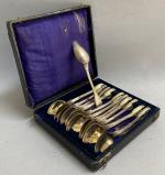 Douze CUILLERES A THE en vermeil, modèle filets, chiffrées Vieillard et Minerve Poids: 230 gr (dans un écrin)