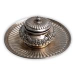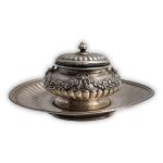 ENCRIER couvert en argent, à décor de godrons et guirlande de fleurs Minerve. Orfèvre: Eugène MICHAUT (1882-1896) H.: 6.5 cm D.: 12.5 cm Poids net: 148 gr