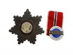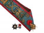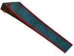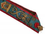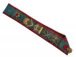 [franc maçonnerie] ECHARPE brodée avec attributs: Temple, compas, équerre, truelle, ... L.: 72.5 cm (on y joint deux décorations)
