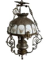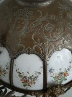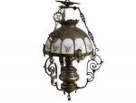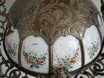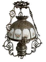SUSPENSION en bronze et plaques de verre peint, à neuf bras de lumière Fin XIXème - début XXème H.: 82 cm (accidents aux verres)