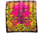Gianfranco FERRE Carré soie imprimée Motif fruits fond rose fushia bordure marron 85 x 85 cm