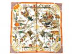 HERMES Paris " Les danses des Indiens" par Kermit Oliver , 1ere édition en 1999 Carré en soie imprimée bordure orange 90 x 90 cm