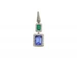 PENDENTIF de style Art Déco en or blanc serti d'une Tanzanite calibrant 1.42 carat surmontée d'une Emeraude pour 0.25 carat dans un entourage de 68 diamants ronds taille moderne pour 0.35 carat, poids 1g85
