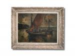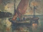 Raphaël LUDOVIC (XXème) Tartanes au port Huile sur toile signée en bas à droite, titrée au dos 46 x 61 cm