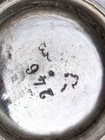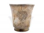 TIMBALE en argent uni, reposant sur une petite base filetée, le col souligné de filets, gravée d'armoiries d'alliance sous une couronne de comte Paris, 1717-22 H.: 8.2 cm Poids: 116 gr (accidents)